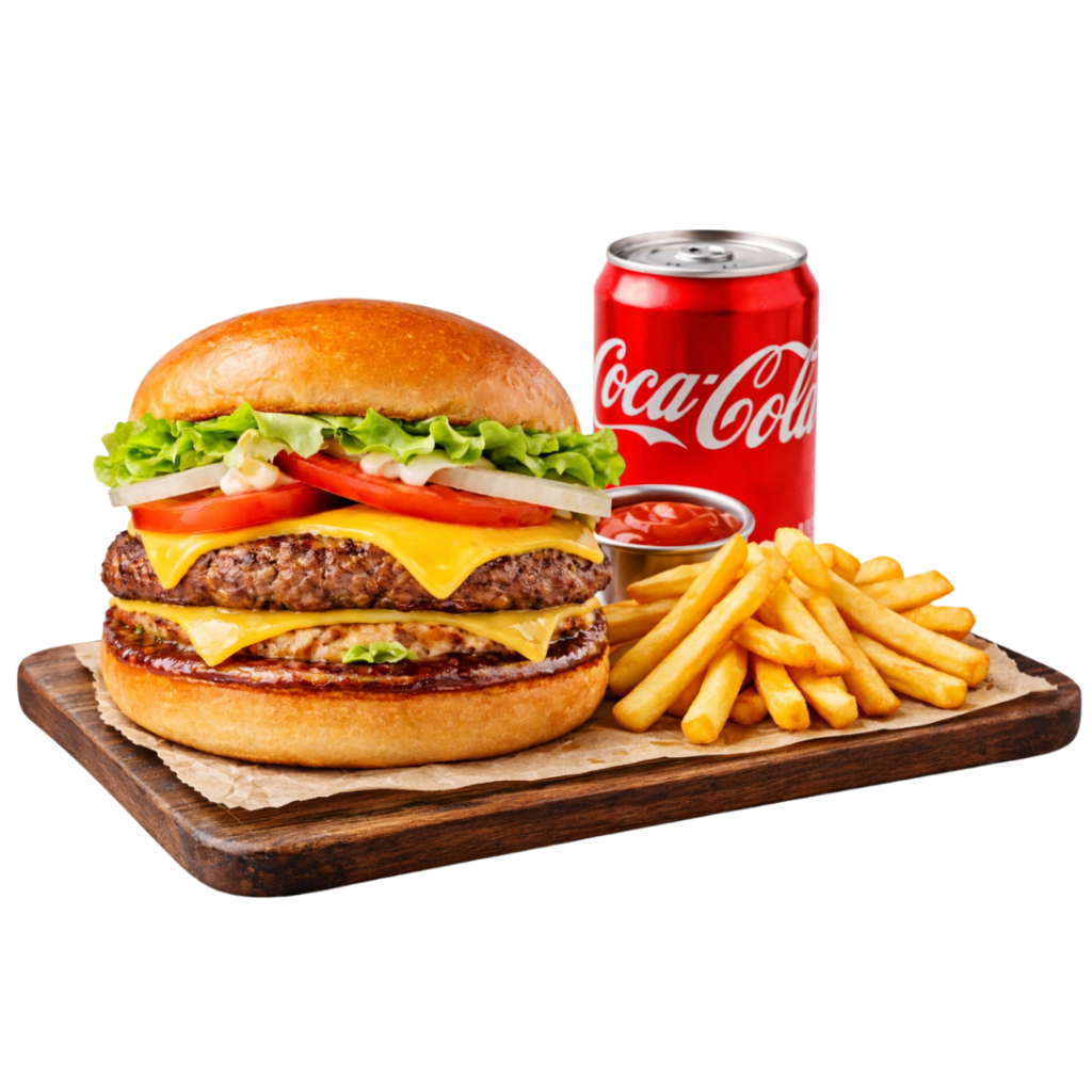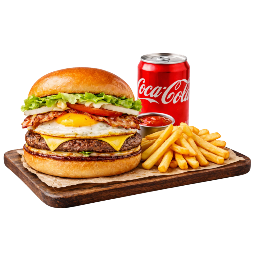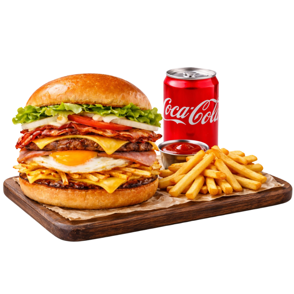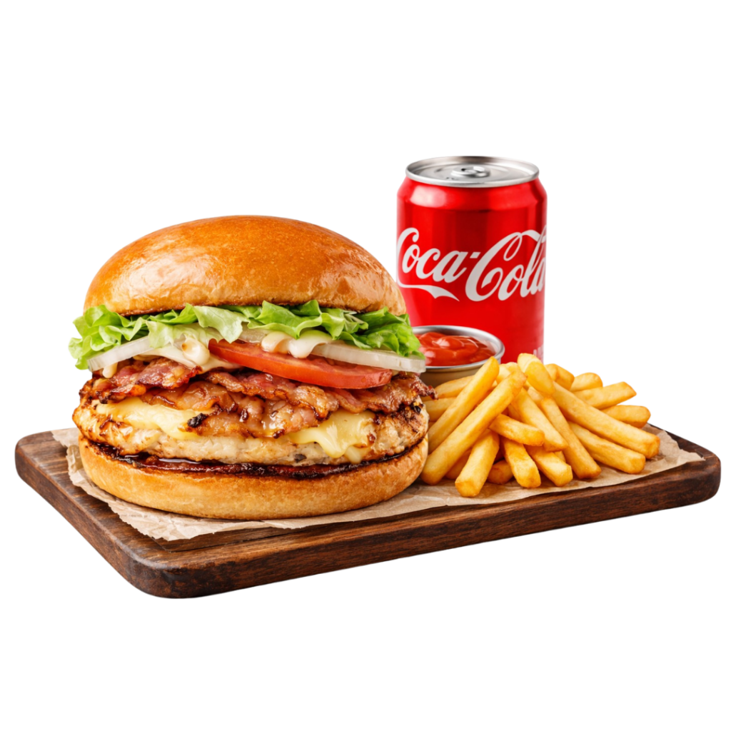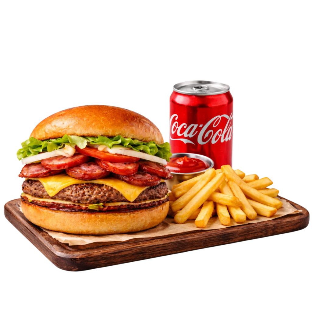 1 lanche X-Bacon, 1 porção de fritas pequena e 1 refrigerante ou suco lata